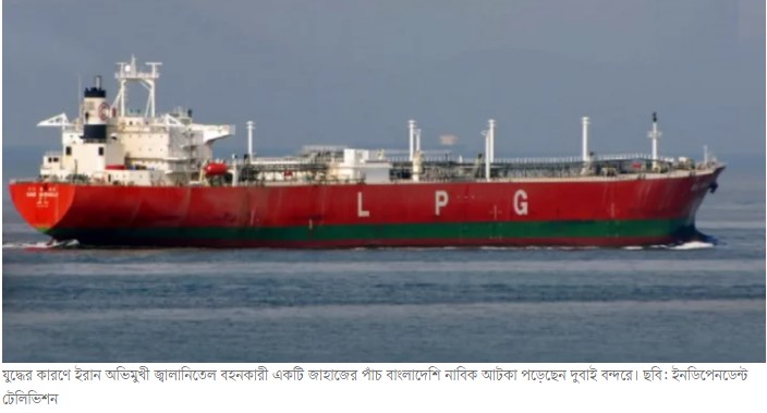 যুদ্ধের কারণে ইরান অভিমুখী জ্বালানিতেল বহনকারী একটি জাহাজের পাঁচ বাংলাদেশি নাবিক আটকা পড়েছেন দুবাই বন্দরে। যুদ্ধের মধ্যে জাহাজটির পরের গন্তব্য