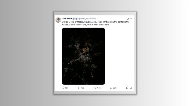 ভূ-পৃষ্ট থেকে প্রায় ৩৫০ কিলোমিটার উচ্চতায় অবস্থিত মহাকাশ স্টেশন থেকে স্যাটেলাইটের মাধ্যমে তোলা মক্কার মসজিদ আল হারামের সেই ছবি মুহূর্তেই ব্যাপক সাড়া ফেলেছে সামাজিক যোগাযোগের মাধ্যমে।