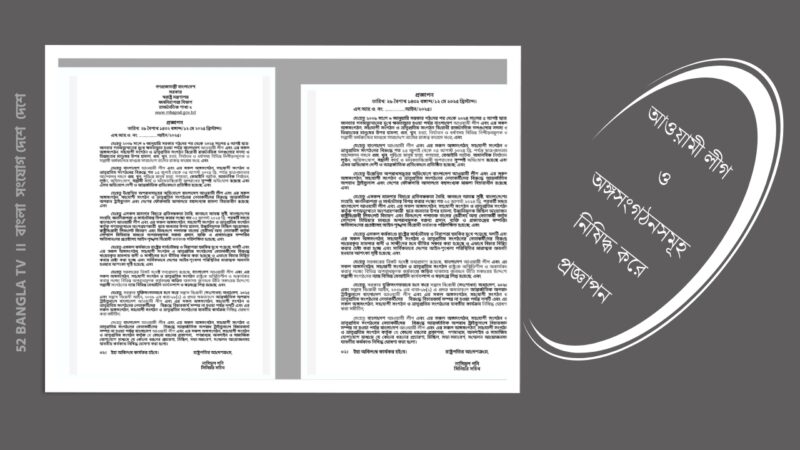 আওয়ামী লীগ ও অঙ্গসংগঠনসমূহ নিষিদ্ধ করে প্রজ্ঞাপন
